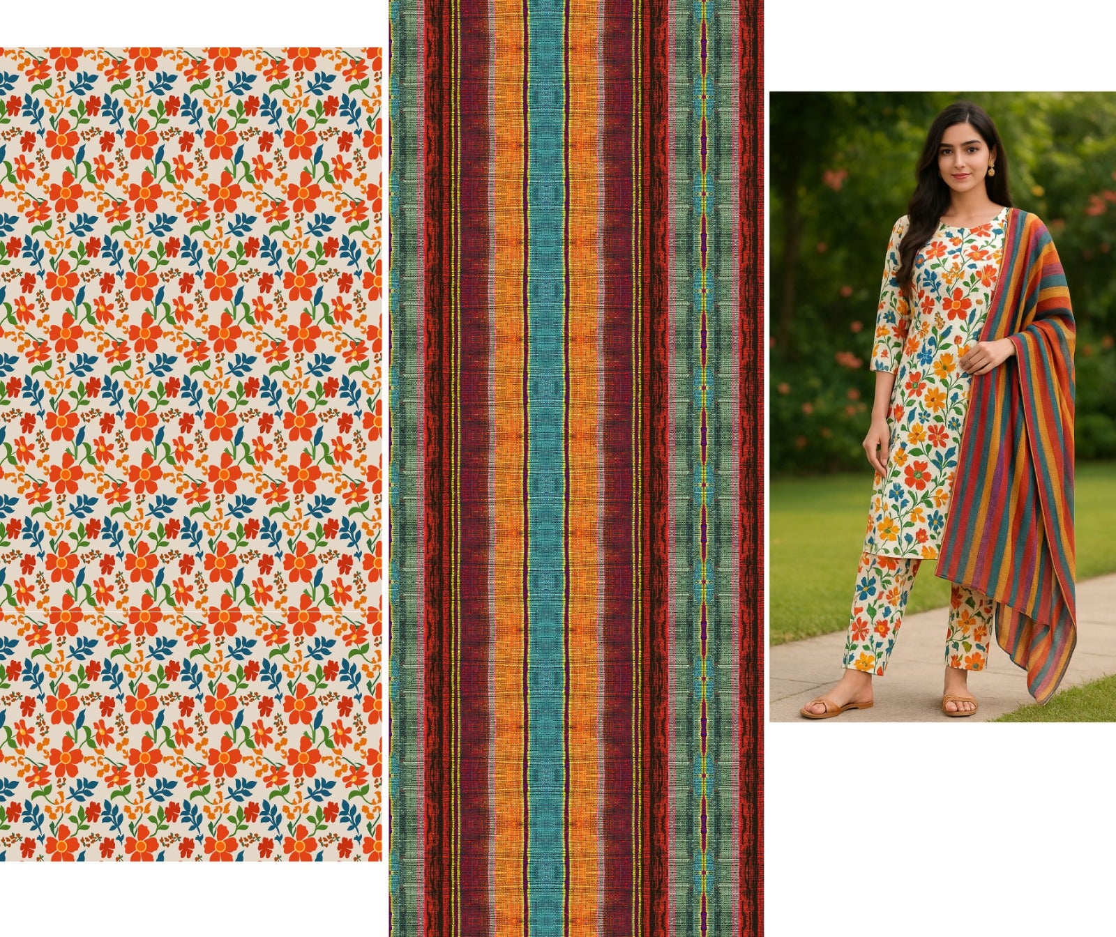 An elegant off-white salwar kameez adorned with refreshing floral prints in vibrant red, pink, and green tones. The light base enhances the charm of the colorful flowers, while the matching printed dupatta adds grace and sophistication.