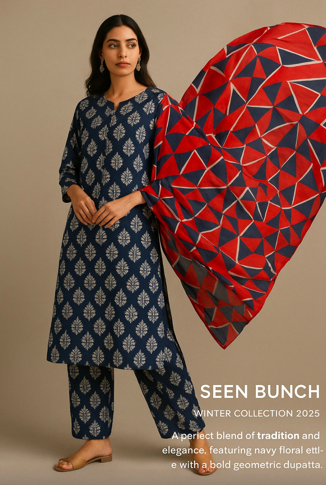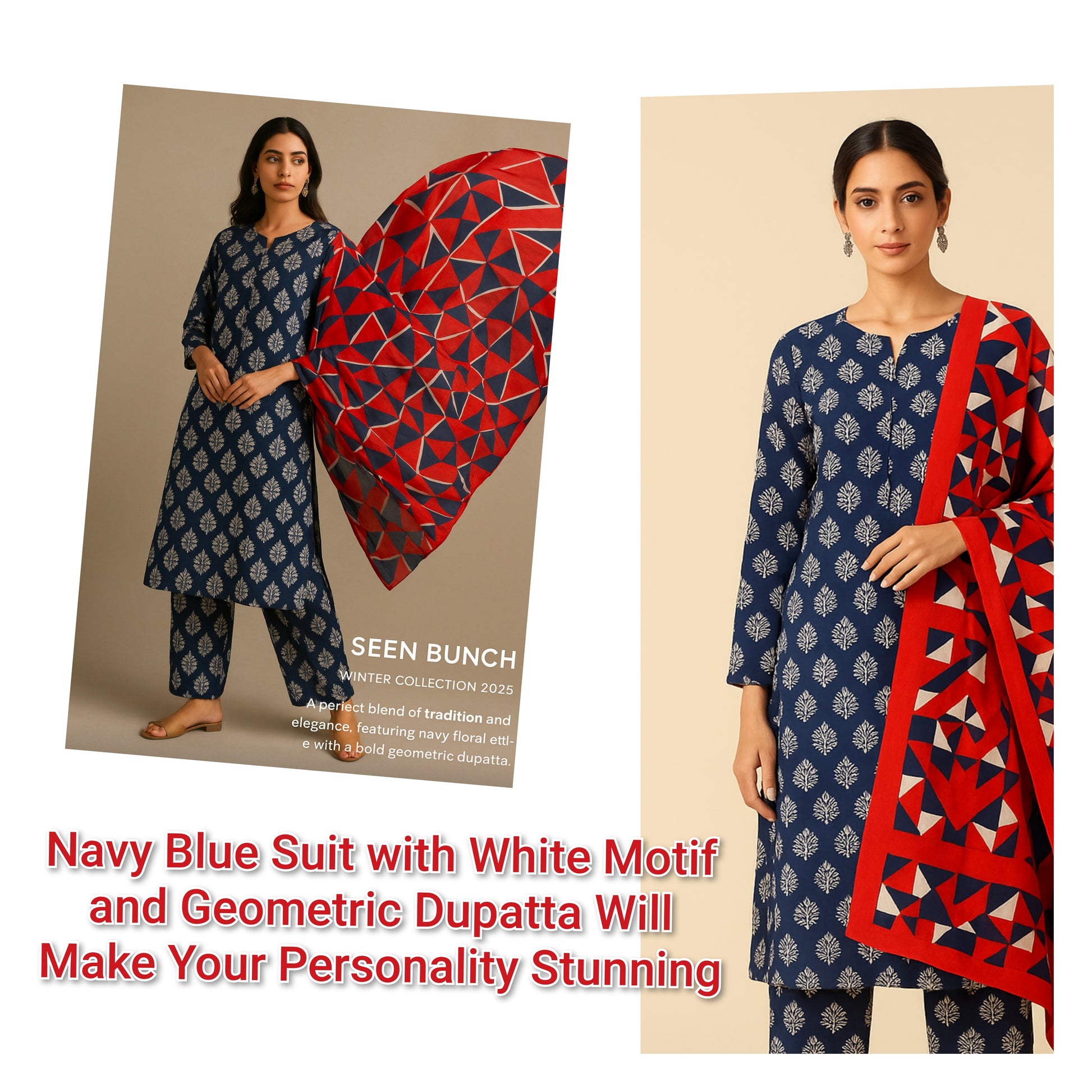 This graceful **navy blue suit** is adorned with delicate **white paisley motifs**, creating a timeless and elegant look. It comes with a luxurious **pashmina shawl**, featuring a striking **geometric design** in shades of **red, blue, and white**۔